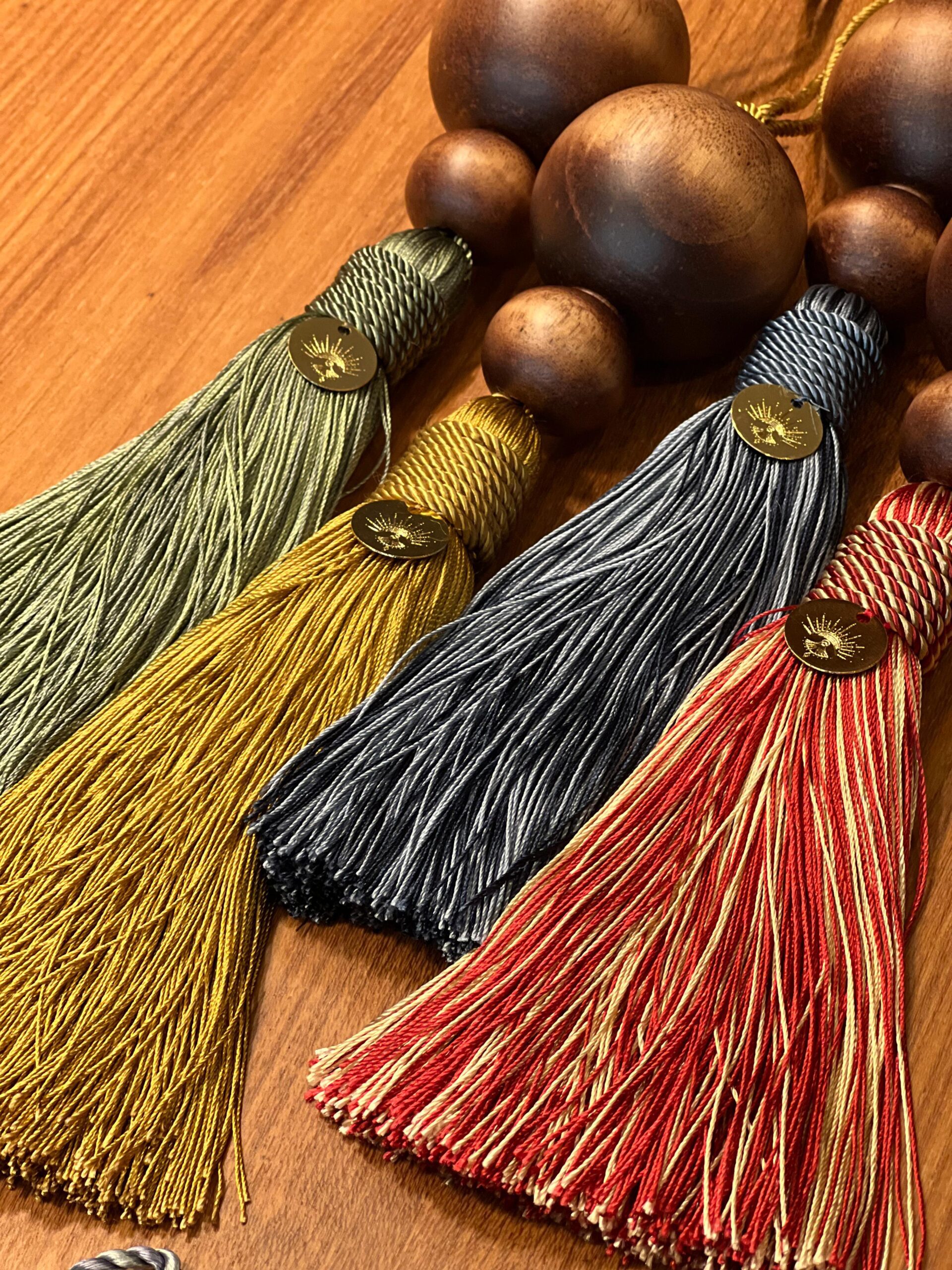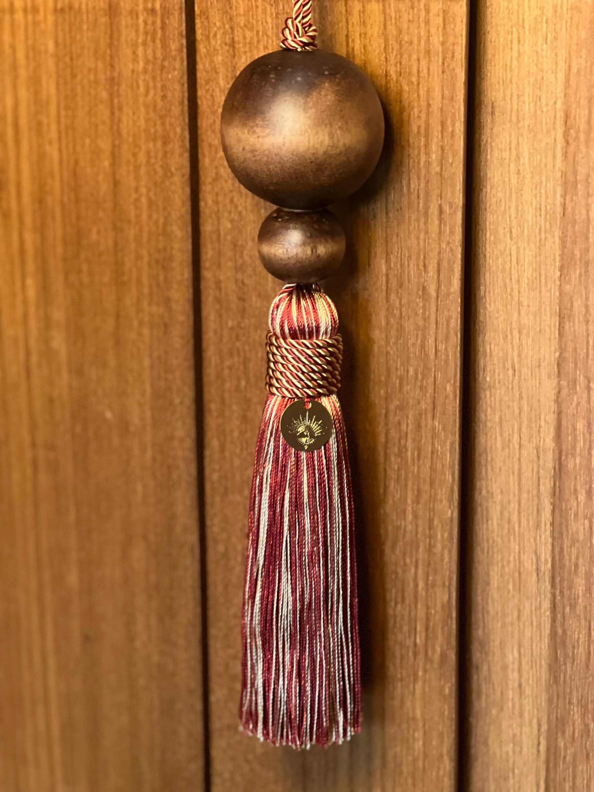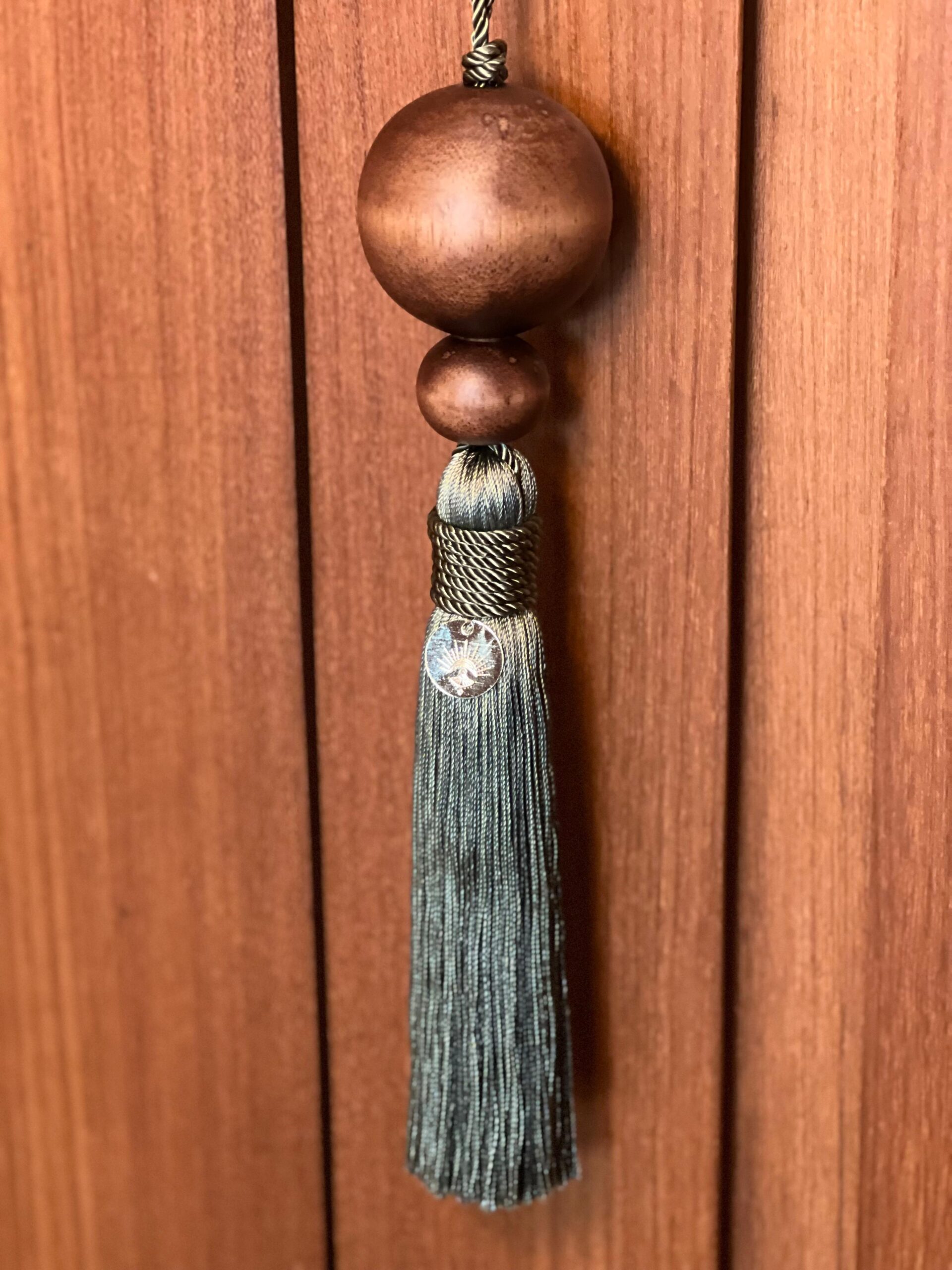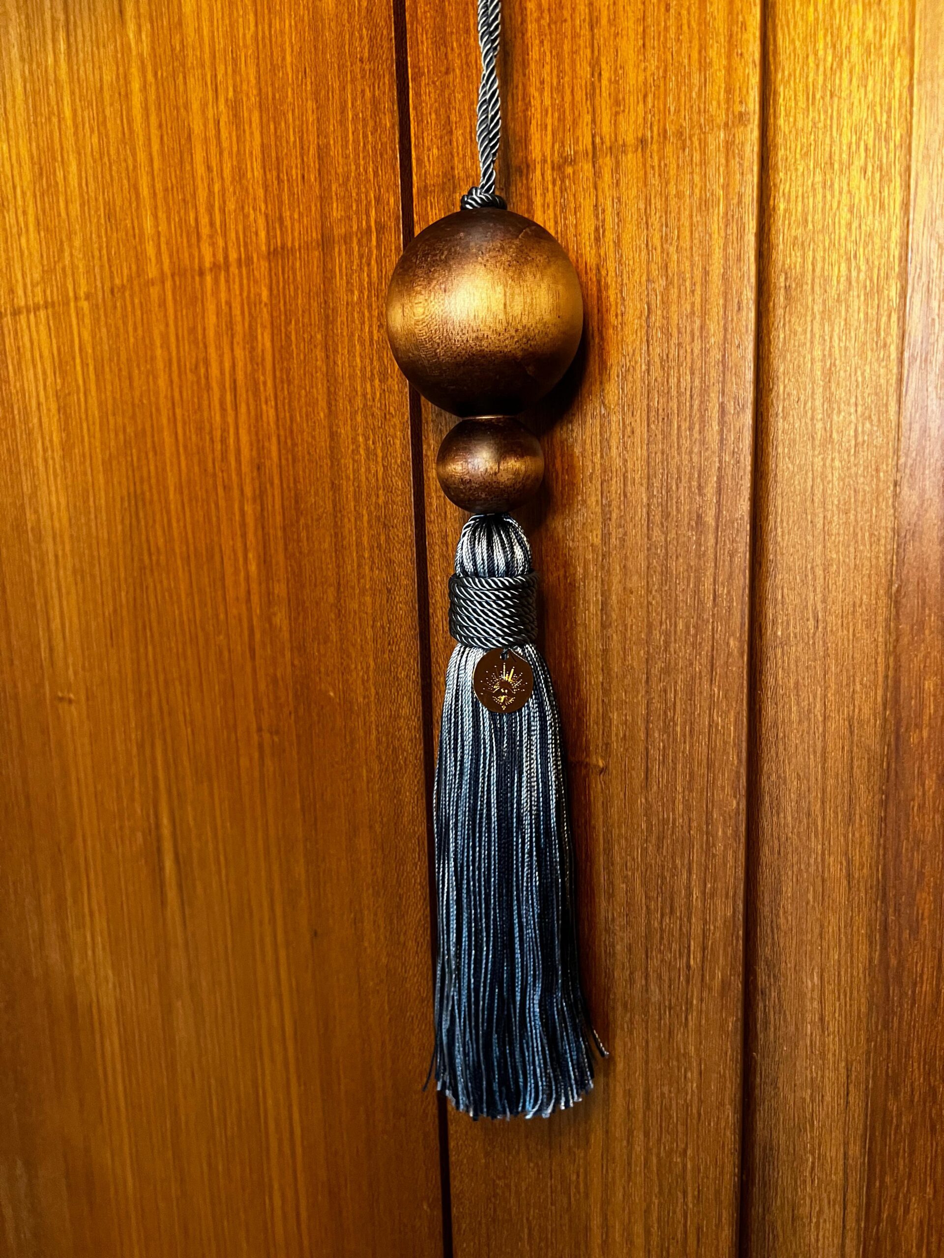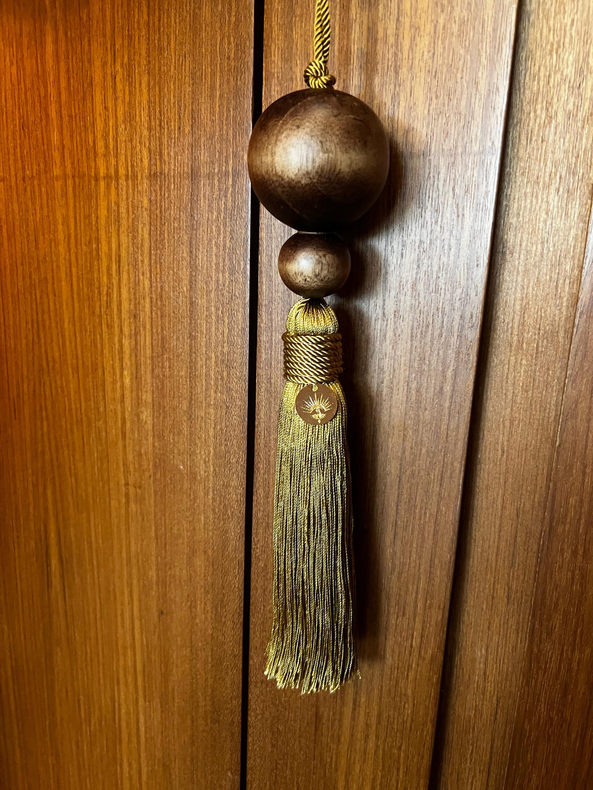 Amulettes para portas, com passamanaria em seda pura e bolas de madeira torneadas a mão.