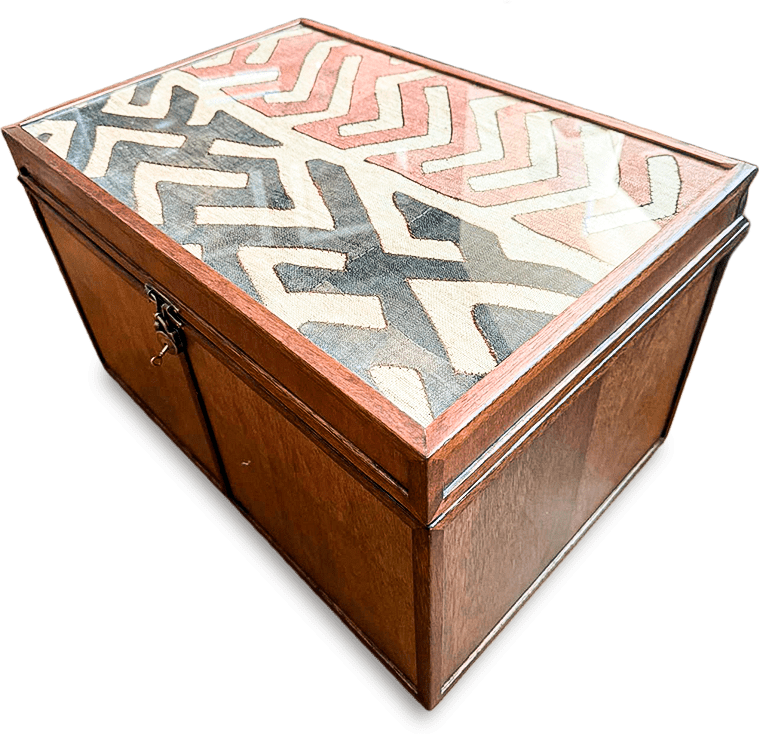 Baú com tampo em tecido Kuba Raffia Africano artesanal.