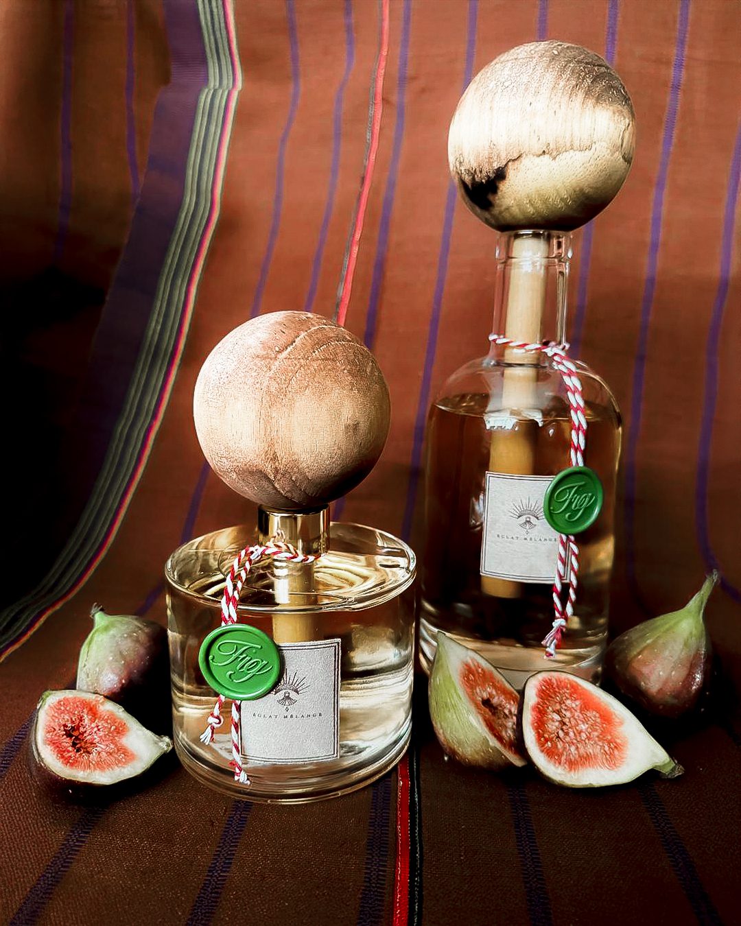aroma de figo, base em vidro, haste difusora em madeira maciça torneada a mão.