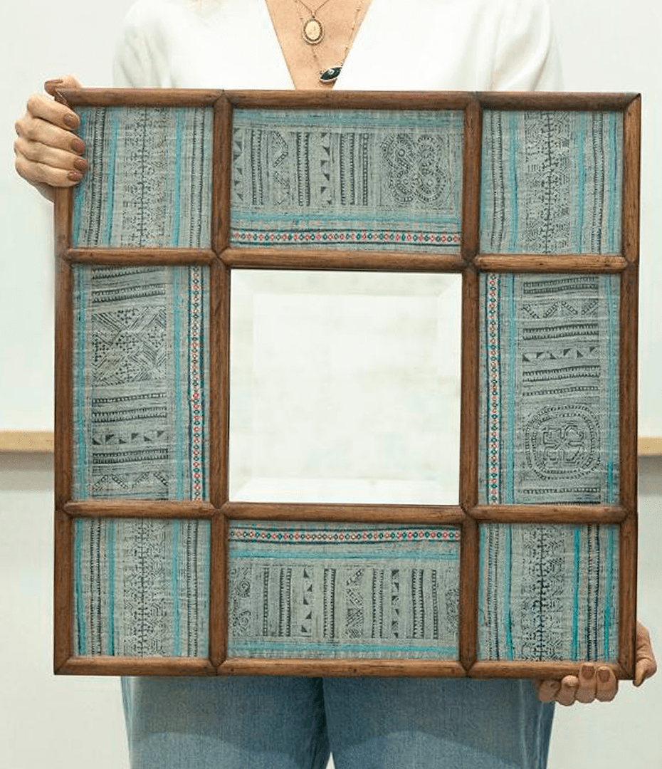 Mesa lateral com tampo em tapeçaria kilim xadrez.